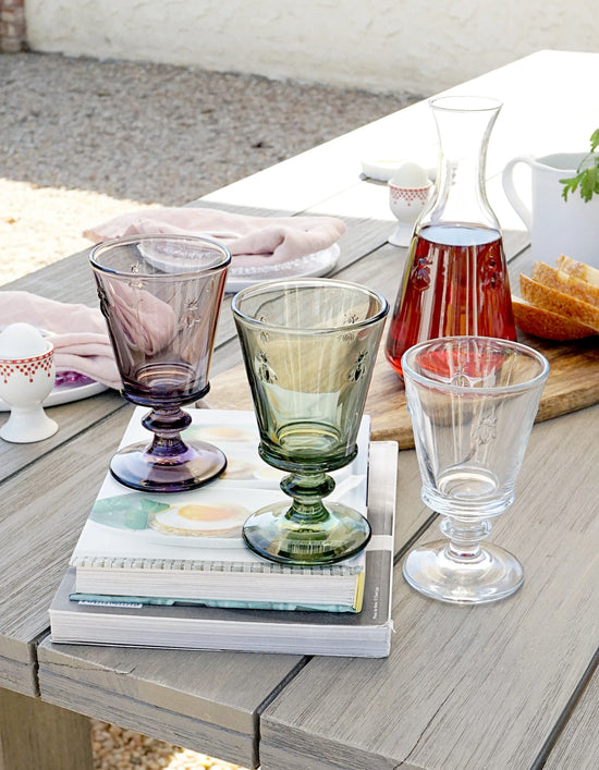 Bee Colored Wine GlassBee wine glass come in purple, green, and clear colors that can highlight your French table setting.